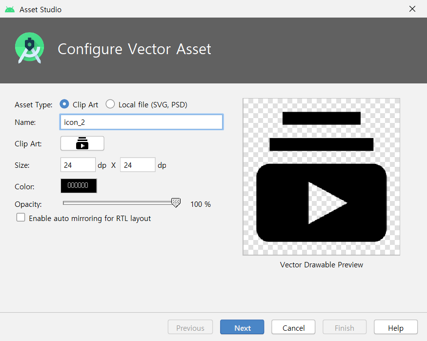 res -> drawable 폴더 우클릭 -> New -> Vector Asset 에서 본인이 원하는 이미지를 세개 준비한다.