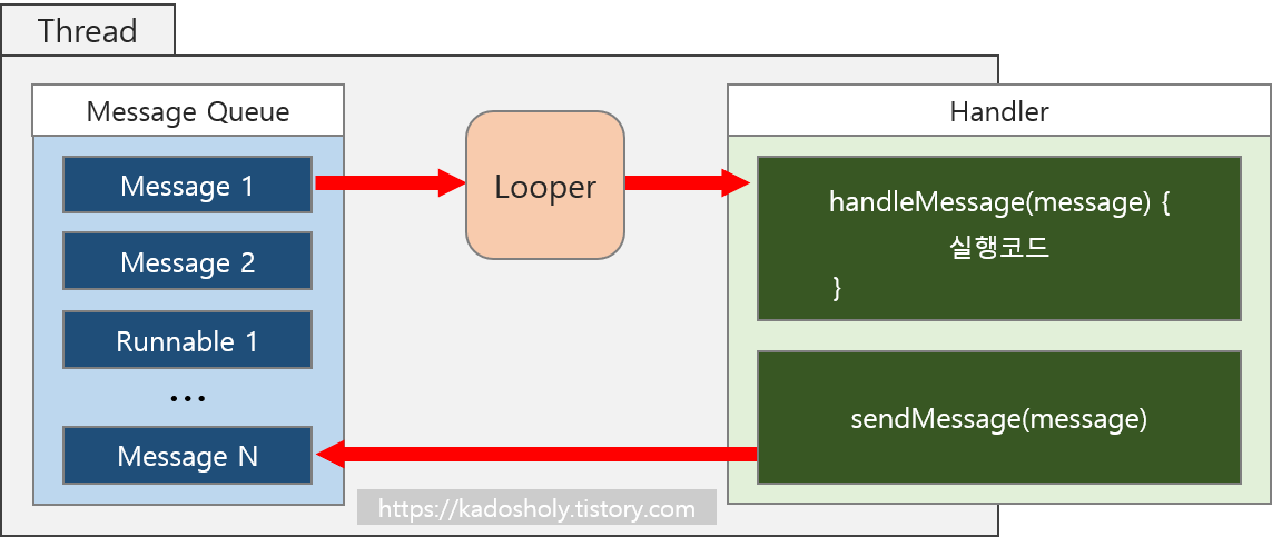 - Handler에서는 Message객체를 전달 받아 해당 실행코드를 수행하며, 또한 sendMessage( )메소드를 통해 MessageQueue에 Message 객체를 전달하는 역할도 수행합니다.