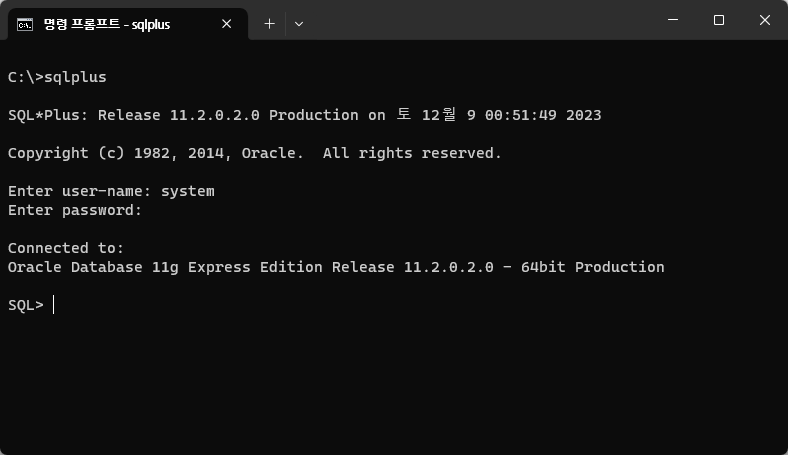 윈도우 cmd 창에서는 sqlplus 실행후 system 계정으로 접속하여 사용할 수 있습니다.