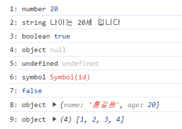 - object : 객체 자료형으로 { }안에 여러개의 값을 key와 value로 저장할 수 있습니다.
