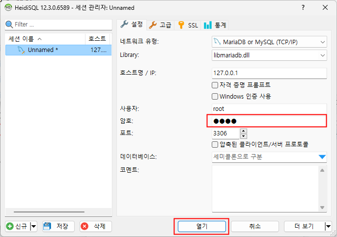 설치시 입력한 root 계정의 비밀번호를 입력한 후 [열기] 버튼을 클릭합니다.