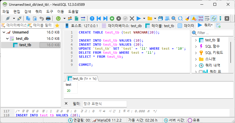 새 계정으로 접속한 HeidiSQL창에서 test_tb 테이블을 선택한 후 쿼리문을 실행하여 정상적으로 동작하는지 확인해 봅니다.