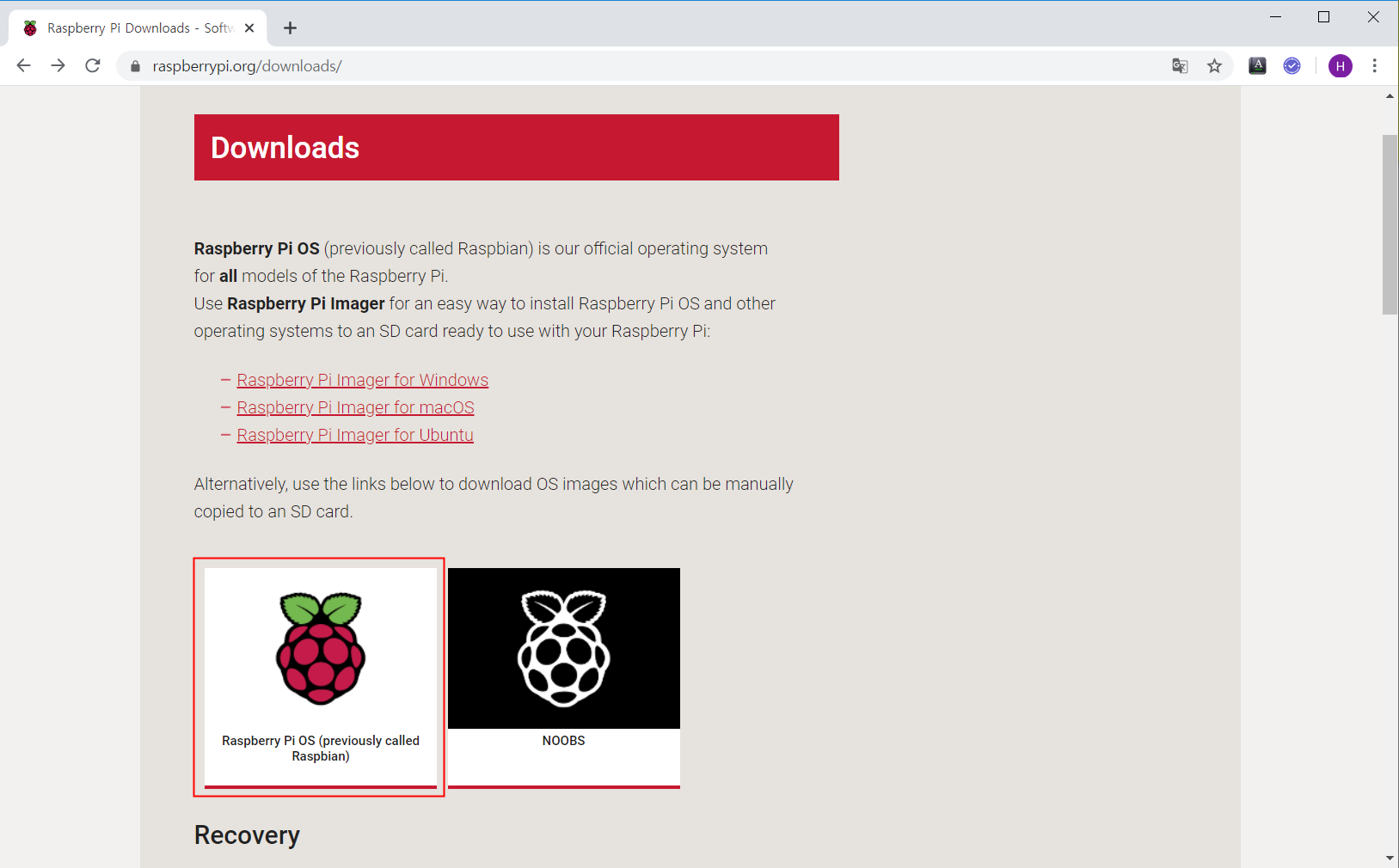 Downloads 밑에 Raspberry Pi OS (previously called Raspbian) 이미지를 클릭합니다.