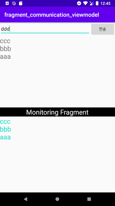 예제는 ChattingFragment의 채팅창 입력내용이 MonitoringFragment에 전달되어 Monitoring Fragment 채팅창에 실시간 반영되도록 하는 간단한 예제입니다.