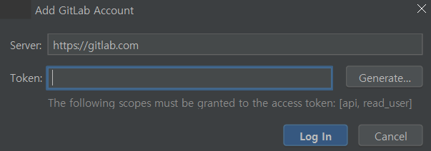 GitLab의 경우 id/password 대신 토큰 인증 방식을 권장하고 있어 아래와 같이 Add GitLab Account 창이 나타납니다. 이때 GitLab에서 토큰을 발급받아 토큰 값을 입력해주면 원격저장소에 업로드가 진행됩니다.