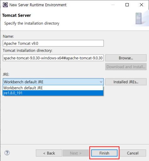 5) 설치된 jre 버전이 메뉴에 있으면 선택하고 없으면 Workbench default JRE를 선택합니다.