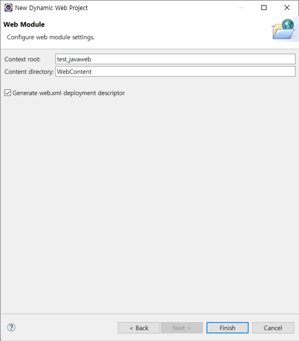 (1) [Context root:] 의 test_javaweb은 나중에 웹에서 접근시 url에 아래와 같이 포함됩니다.