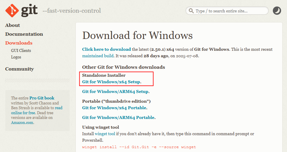 - Standalone Installer : 실행파일을 다운받아 설치하며 설치시 시스템에 Git 등록 및 사용환경을 설정해 줍니다.