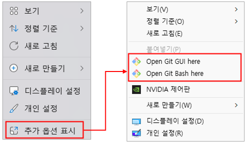 Git 설치가 정상적으로 완료되었다면 아래 그림과 같이 우클릭을 하였을 경우 "Git GUI Here", "Git Bash Here" 메뉴가 나타납니다.
