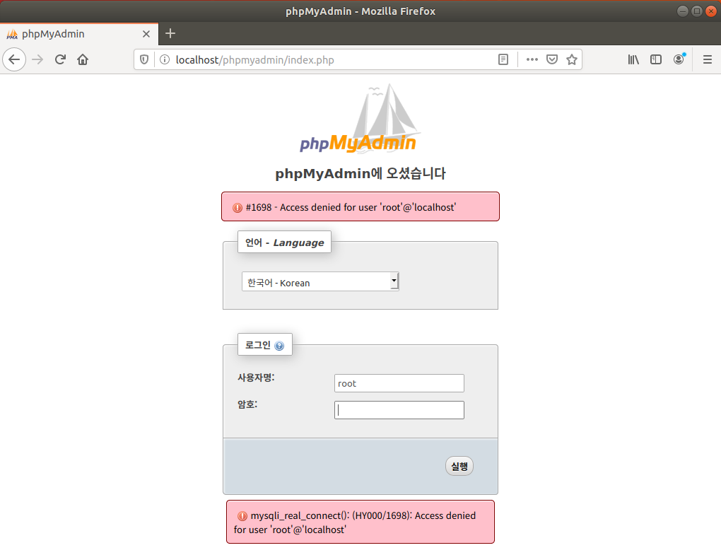 설치를 정상적으로 끝내고 phpMyAdmin에서 root 계정으로 접속을 시도하면 아래와 같이 에러가 발생한다.