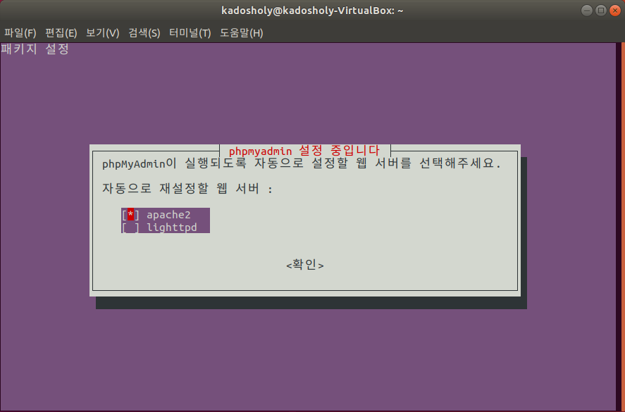 1) 아래 화면이 나오면 Space바를 눌러 apache2를 선택후 Enter