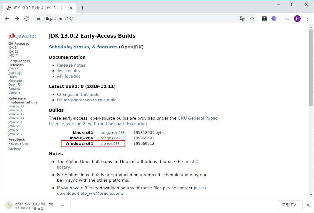 홈페이지에 접속하면 첫화면 중간쯤 나오는 [Download]에서 [jdk.java.net/13] 링크 클릭하여 이동후 Windows/x64 버전을 다운로드 받습니다.