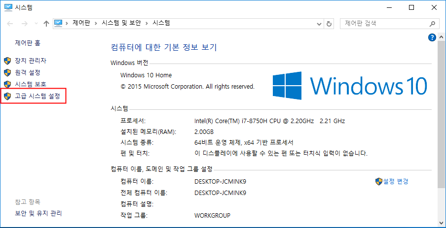 1) 제어판 -> 시스템 및 보안 -> 시스템 창을 열고 [고급 시스템 설정]을 클릭합니다. (단축키 : 윈도우키 + Pause키)
