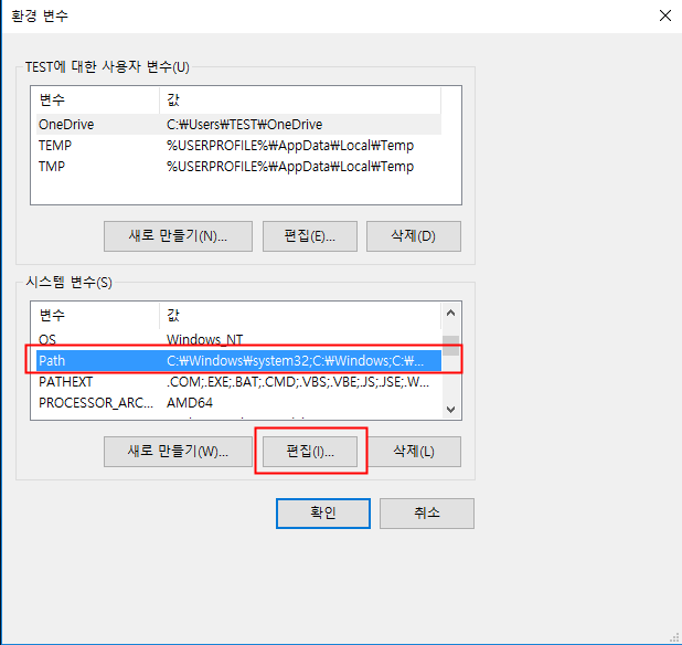 5) JAVA_HOME 시스템변수를 등록했으면 시스템변수창에서 Path 항목을 찾아 선택한후 [편집(I)...] 버튼을 클릭합니다.