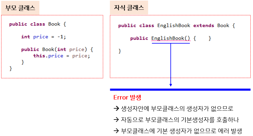 - 자식 클래스의 모든 생성자는 부모 클래스의 생성자를 포함하고 있어야 합니다. 그런데 만약 자식 클래스의 생성자에 부모 클래스의 생성자가 지정되어 있지 않다면, 컴파일러가 자동으로 부모 클래스의 기본생성자를 호출합니다. (이러한 경우, 부모클래스에 매개변수가 있는 생성자만 있고, 기본생성자가 없어 기본생성자를 호출할수 없다면 에러가 발생합니다.)